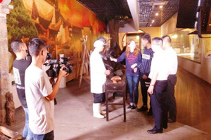 在《常中丞筆記》中,火腿叫做蘭熏,《東陽縣志》稱熏蹄,《本草求原》稱南腿,由此可觀,火腿此物名聲深遠(yuǎn),頗受眾人喜愛,不然也不會有如此多的“小名”。 10月17日這天,浙江經(jīng)視旅游節(jié)目《48小時》攝制組團(tuán)隊在中國火腿博覽館、世界火腿博覽館開始了“火腿”的探索之旅,從起源伊始談至繁華盛宴,期間故事種種萬千。 從中國火腿博覽館入口處的“百姓勞軍圖”便開始了這場對話。而在博覽館內(nèi)的火腿制作流程雕塑則完全將攝制組吸引,無論是考驗刀工的制作火腿頭道工序——修胚,還是考驗“鹽功”的——上鹽環(huán)節(jié),都深